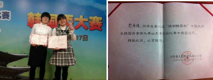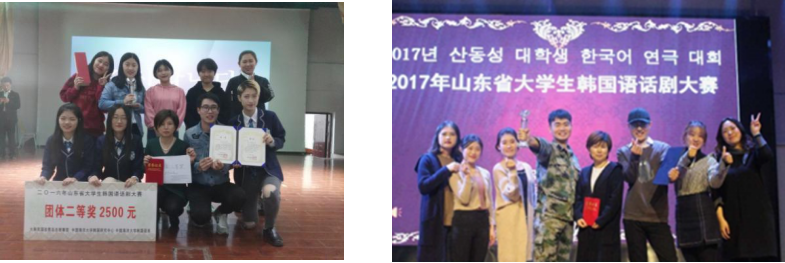 2016、2017连续两年获得山东省大学生韩国语话剧大赛二等奖