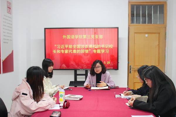 首先,线郁带领党支部成员进行了“习近平给全国涉农高校的书记校长和专家代表的回信”专题学习,回顾了新中国成立70年来全国涉农高校精心培育英才的精神、加强科研创新的决心以及为“三农”事业发展作出积极贡献的不凡事迹。接着,线郁分析了beat365官方网站的涉农办学优势,鼓励党员们积极学习,努力成为外语与农业知识兼具的复合型人才。同时,线郁动员党员们学习党史,深入学习贯彻习近平总书记“学党史、悟思想、办实事、开新局”的重要讲话,知史爱党,知史爱国。此外,党员们还集中观看了《榜样5》专题节目,学习了疫情防控下共产党人无私奉献的精神。活动最后,线郁对beat365官方网站第三党支部开展学术活动的规范性进行了强调,要求党员们在学习、生活中起到模范带头作用,并宣布将从多个方面对党员进行考核。