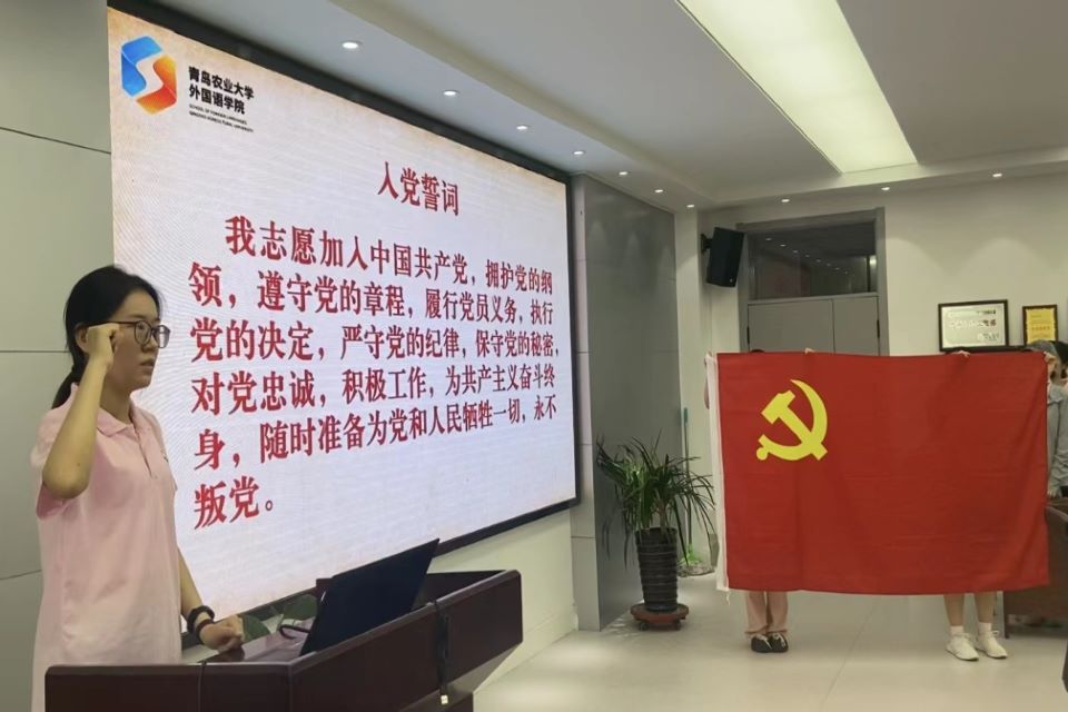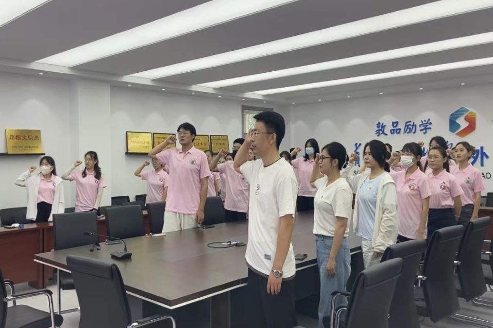 志愿服务队出发前,学院第三党支部书记线郁老师带领支部全体党员重温入党誓词,院学生会主席吴迪同学为领誓人。面对鲜红的党旗,支部党员举起右拳,再次庄严宣誓。口中说出的是誓言,拳头攥紧的是信念。铿锵有力的气势和蓬勃激昂的力量是师生党员向党致以青春的礼赞。
