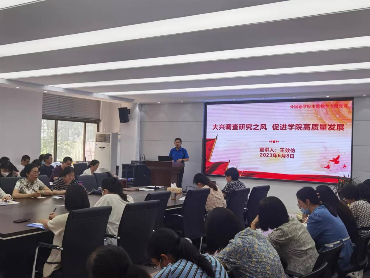 为深入学习贯彻习近平新时代中国特色社会主义思想,扎实做好主题教育和调查研究工作,6月8日,beat365官方网站beat365官方网站于文经楼C220会议室开展“大兴调查研究之风 促进学院高质量发展”主题教育专题党课,学院党委书记王效仿主讲,学院全体教职工参会。