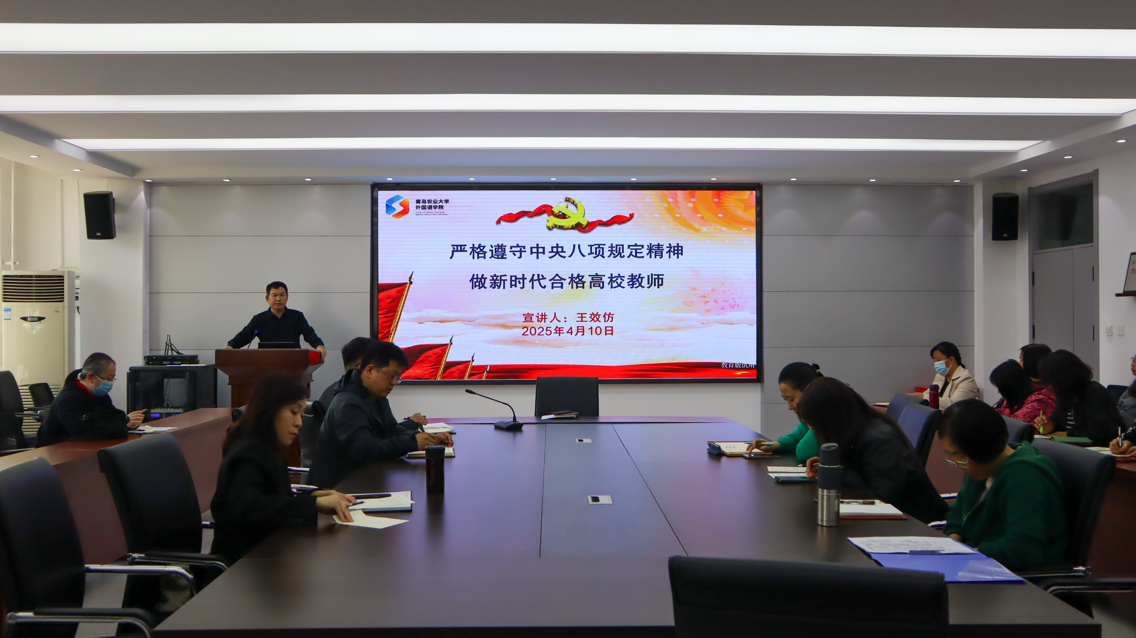 4月10日,beat365官方网站在文经楼会议室组织深入贯彻中央八项规定精神学习教育专题学习。beat365官方网站党委书记王效仿以《严格遵守中央八项规定精神 做新时代合格高校教师》为题讲授专题党课,全体教职工参加学习。