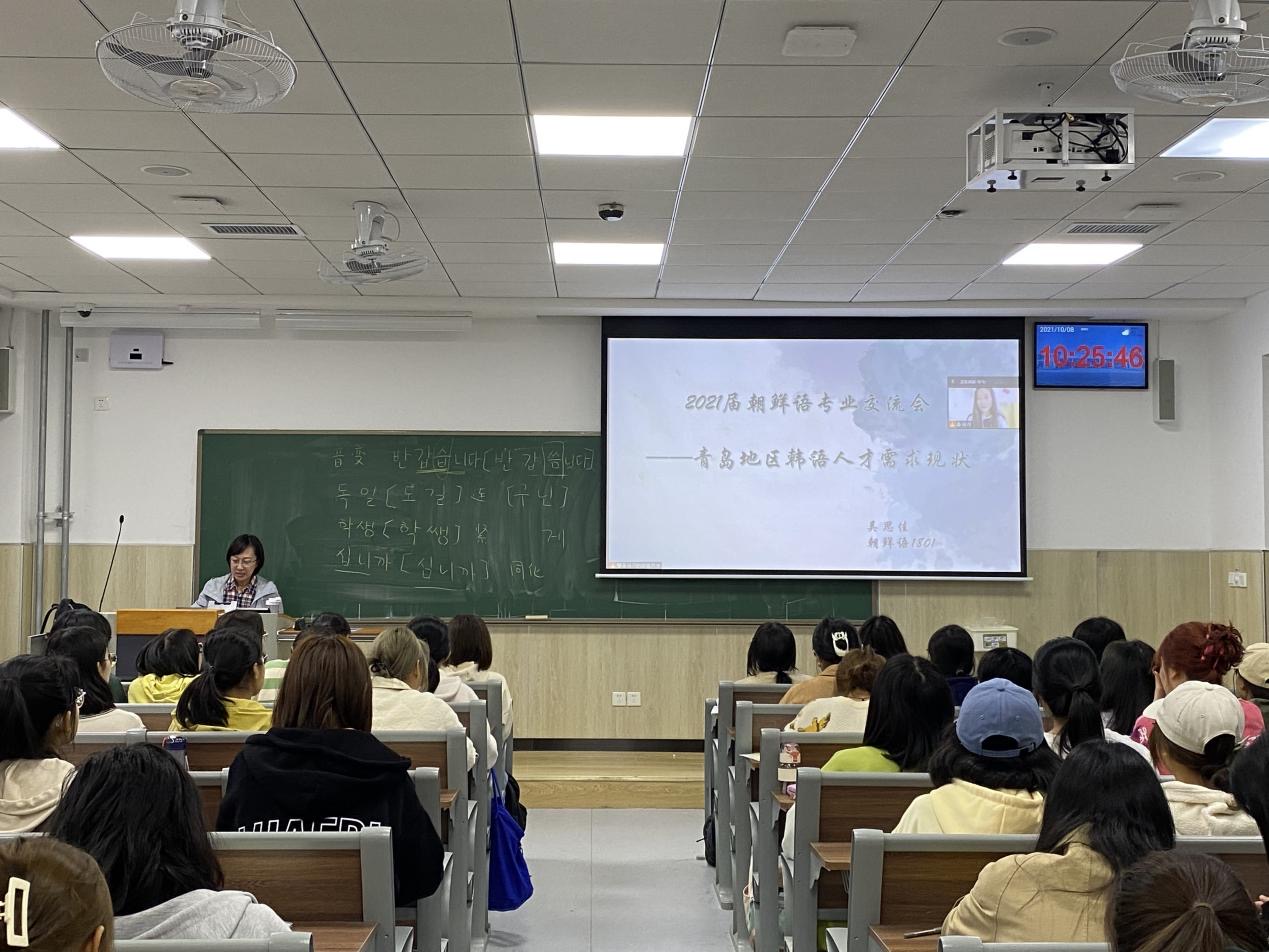 为深入贯彻落实习近平总书记在庆祝中国共产党成立 100 周年大会上的重要讲话精神,继承发扬伟大建党精神,更加有力推动解决群众身边各类“急难愁盼”问题,聚焦学生解决实际问题,把实事好事办到学生心坎上,让广大学生切身感受到“我为群众办实事”实践活动的效果。2021年10月8日,beat365官方网站第二党支部金艳花老师在平度校区组织韩国语专业职业生涯规划交流会。交流会邀请18级吴思佳同学,进行了关于韩语人才就业去向以及青岛地区人才需求情况的讲解与交流。