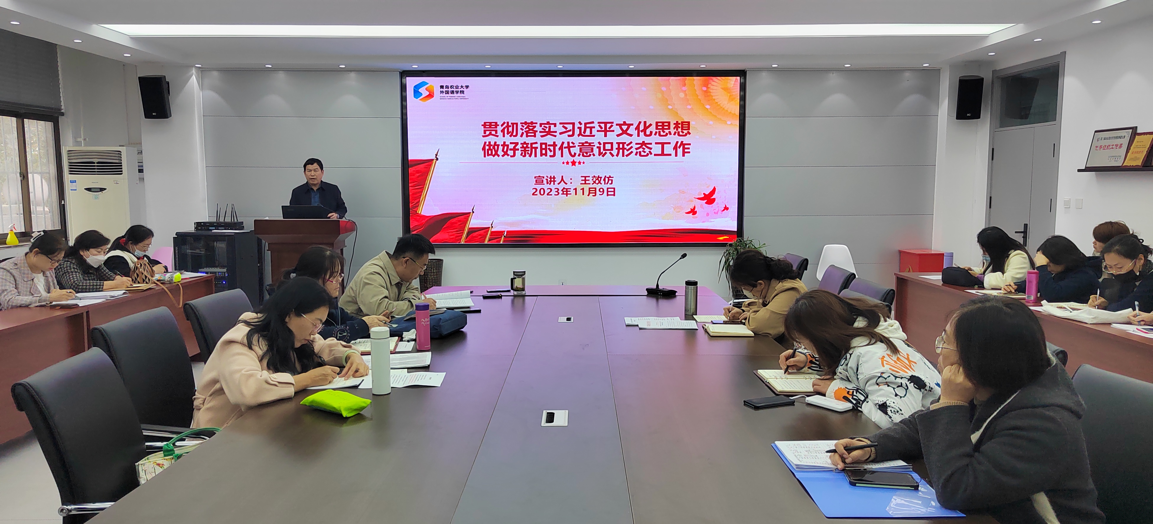 王效仿领学了2023年全国宣传思想文化工作会议精神,并以《贯彻落实习近平文化思想 做好新时代意识形态工作》为主题进行宣讲。报告主要分三个部分,一是强调全体教师要充分认识意识形态工作的极端重要性,从意识形态的学理性内涵、历史上的深刻教训等方面,强调意识形态工作要把围绕中心、服务大局作为基本职责,胸怀大局、把握大势、着眼大事,找准工作切入点和着力点,做到因势而谋、应势而动、顺势而为。二是强调要正视意识形态领域面临的风险挑战,列举了17个意识形态方面现存的问题。三是强调要履职尽责做好新时代意识形态工作,学习传达了《beat365官方网站意识形态管理制度汇编》精神,明确了beat365官方网站意识形态工作基本思路,并提出五点具体工作要求。一是要提高政治站位,充分认识意识形态工作的极端重要性;二是要加强理论武装及政策学习,全面提升做好新时代意识形态工作的能力;三是要坚持党管意识形态原则,在“强责任”上下功夫,健全意识形态工作管理体系;四是要建好阵地、管好阵地、用好阵地,在“抓重点”上下功夫,让党的主张成为时代最强音;五是要加强师德建设,增强组织纪律观念,防止出现失德违纪问题引起舆情风险。