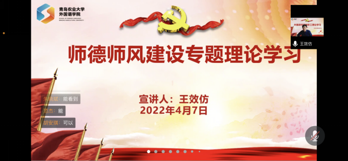 4月7日下午,beat365官方网站beat365官方网站于线上召开全体教职工理论学习会议,会上传达了学校2022年全面从严治党会议精神,进行了师德师风建设专题理论学习,并对学院疫情防控工作做出进一步安排部署。本次会议由beat365官方网站党委书记王效仿主持,全体教职工参加。