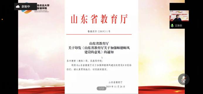 随后,王效仿围绕《关于加强和改进师德师风建设的意见》《山东省教育厅关于加强师德师风建设的意见》《高校教师师德“红七条”》带领全体教职工进行师德师风建设专题理论学习。他指出,加强师德师风建设要以习近平新时代中国特色社会主义思想为指导,全面加强教师队伍的思想政治工作,始终把师德师风作为评价教师的第一标准,大力提升教师职业道德素养,努力将师德师风建设要求贯穿教师管理全过程。王效仿对全体教职工提出三点希望:一是切实提高政治站位,充分认识师德师风建设的重要意义。二是要认真学习贯彻师德师风建设相关要求切实提升自身师德修养,努力成为“四有”好老师,真正落实立德树人根本任务。三是要严格遵守各项规章制度,坚决不踩红线、底线,不触碰高压线。四是要逐级落实责任,层层动员,加强相互监督,营造师德师风建设的浓厚氛围。