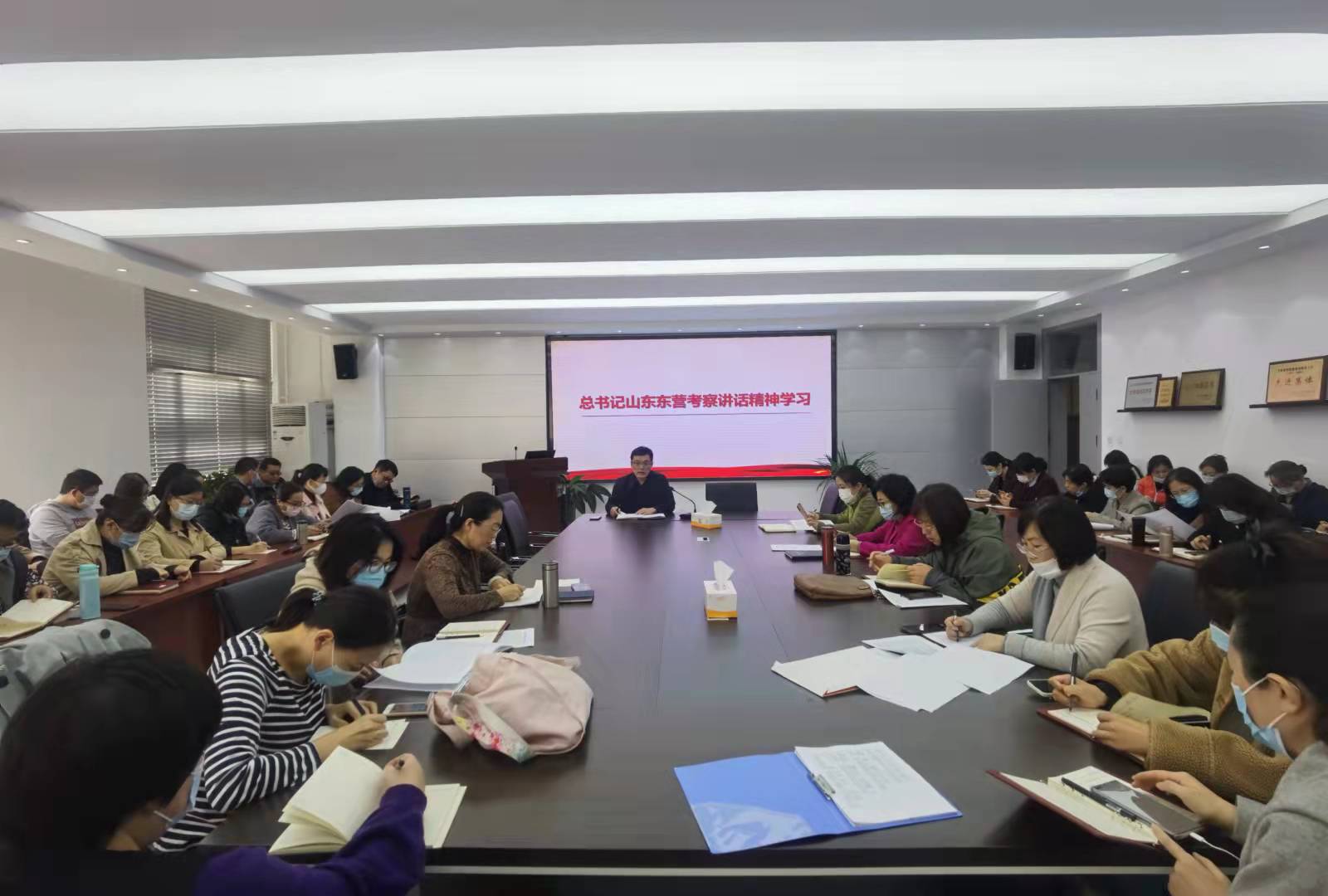 首先,会议以图文的形式向教职工们介绍了习近平总书记在黄河三角洲农业高新技术产业示范区、黄河滩区居民迁建社区、莱州湾胜利油田等地的考察情况。然后,会议重点学习了“深入推动黄河流域生态保护和高质量发展座谈会”的讲话精神。焦磊指出,习近平总书记的重要讲话深刻阐释了黄河流域生态保护和高质量发展的重大理论和实践问题,提出了新观点新要求,立意高远、内涵丰富,体现了高远深邃的战略思考,展现了统揽全局的系统观念,彰显了至深至厚的人民情怀,发出了为黄河永远造福中华民族而不懈奋斗的新号令,指明了前进的目标方向。全体教师要深入学习领会,抓好贯彻落实,以实际行动增强“四个意识”、坚定“四个自信”、做到“两个维护”。
