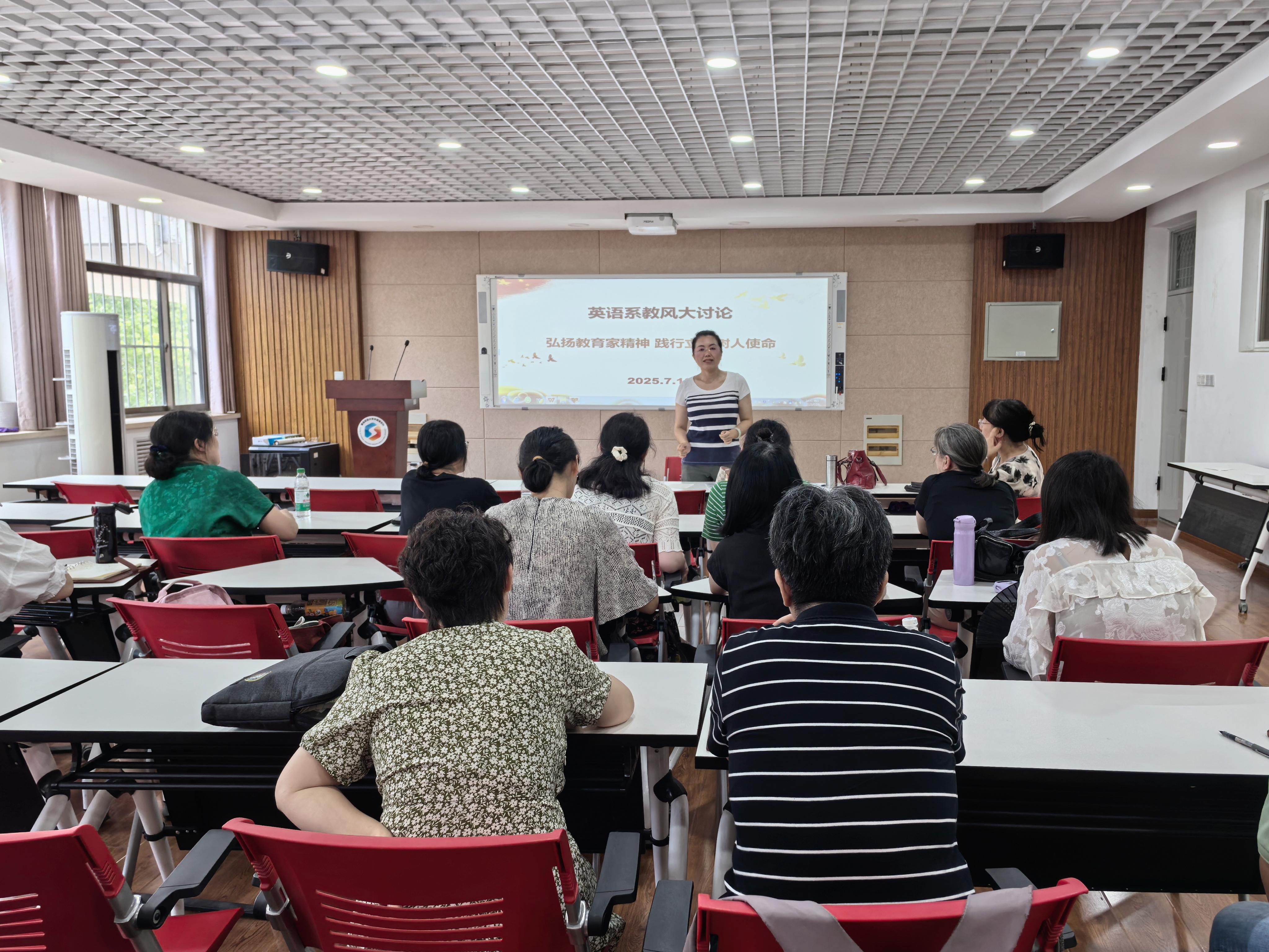 beat365官方网站英语系于2025年7月10日召开教风建设专题研讨会,展开教风大讨论,会议以“弘扬教育家精神,践行立德树人使命”为主题,聚焦教风建设、规范落实与教学创新,老师们一起学习了习近平总书记关于“四有好老师”的重要讲话和《中共中央 国务院关于弘扬教育家精神加强新时代高素质专业化教师队伍建设的意见》等文件。结合英语学科特色,深入探讨了如何将师德师风融入跨文化沟通、语言实践等教学场景,通过优良教风涵养良好学风,树立胸怀天下、以文化人的追求,涵养启智润心、因材施教的育人智慧,不断提升育人能力与水平。