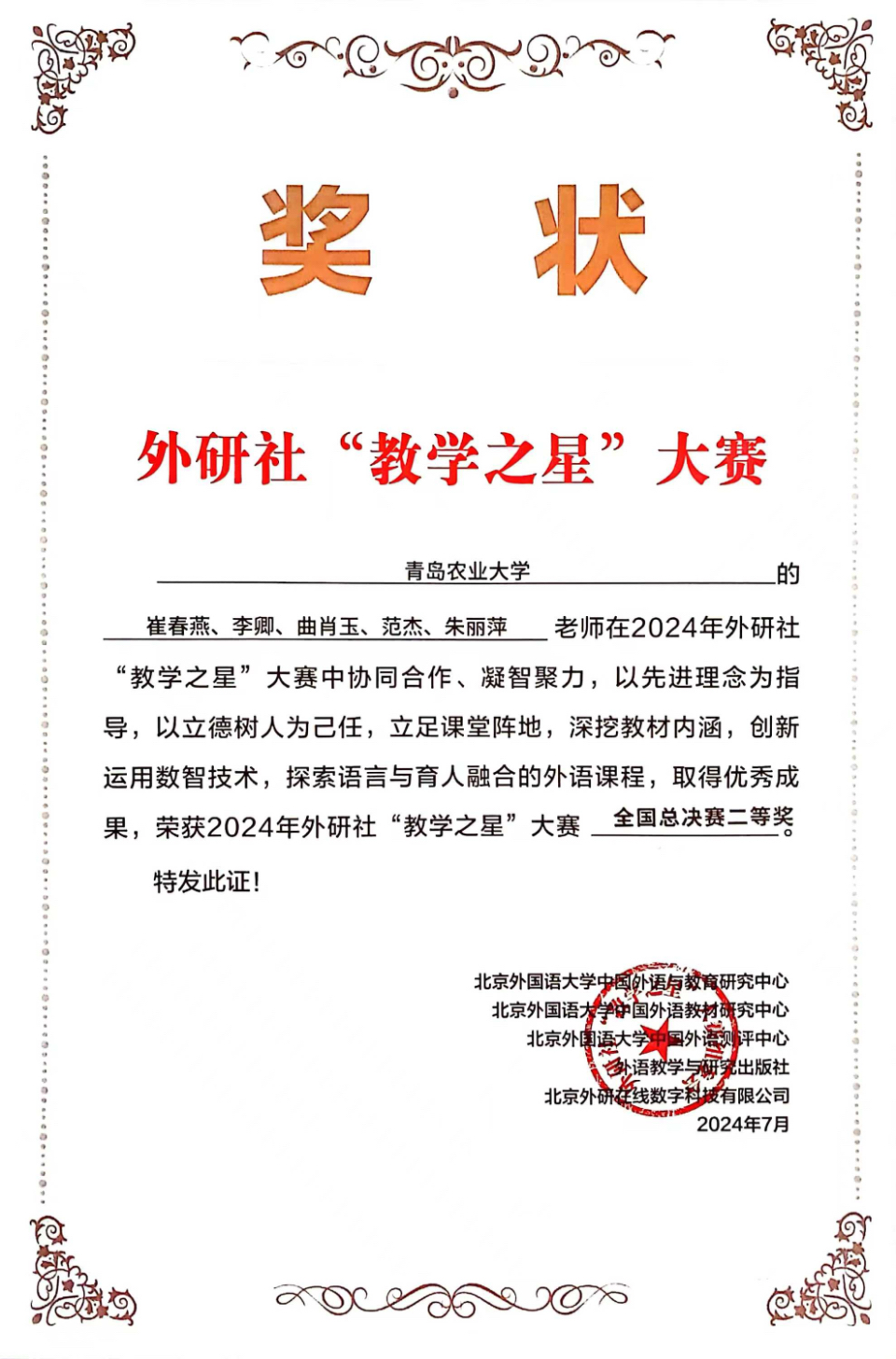2024年7月22-23日,由北京外国语大学中国外语与教育研究中心、北京外国语大学中国外语教材研究中心、北京外国语大学中国外语测评中心和外语教学与研究出版社共同举办的2024年外研社“教学之星”大赛全国总决赛在太原举行。经过激烈比拼,由beat365官方网站大学英语第二教学部崔春燕、李卿、曲肖玉、范杰、朱丽萍五位教师组成的教学团队,荣获全国总决赛二等奖。