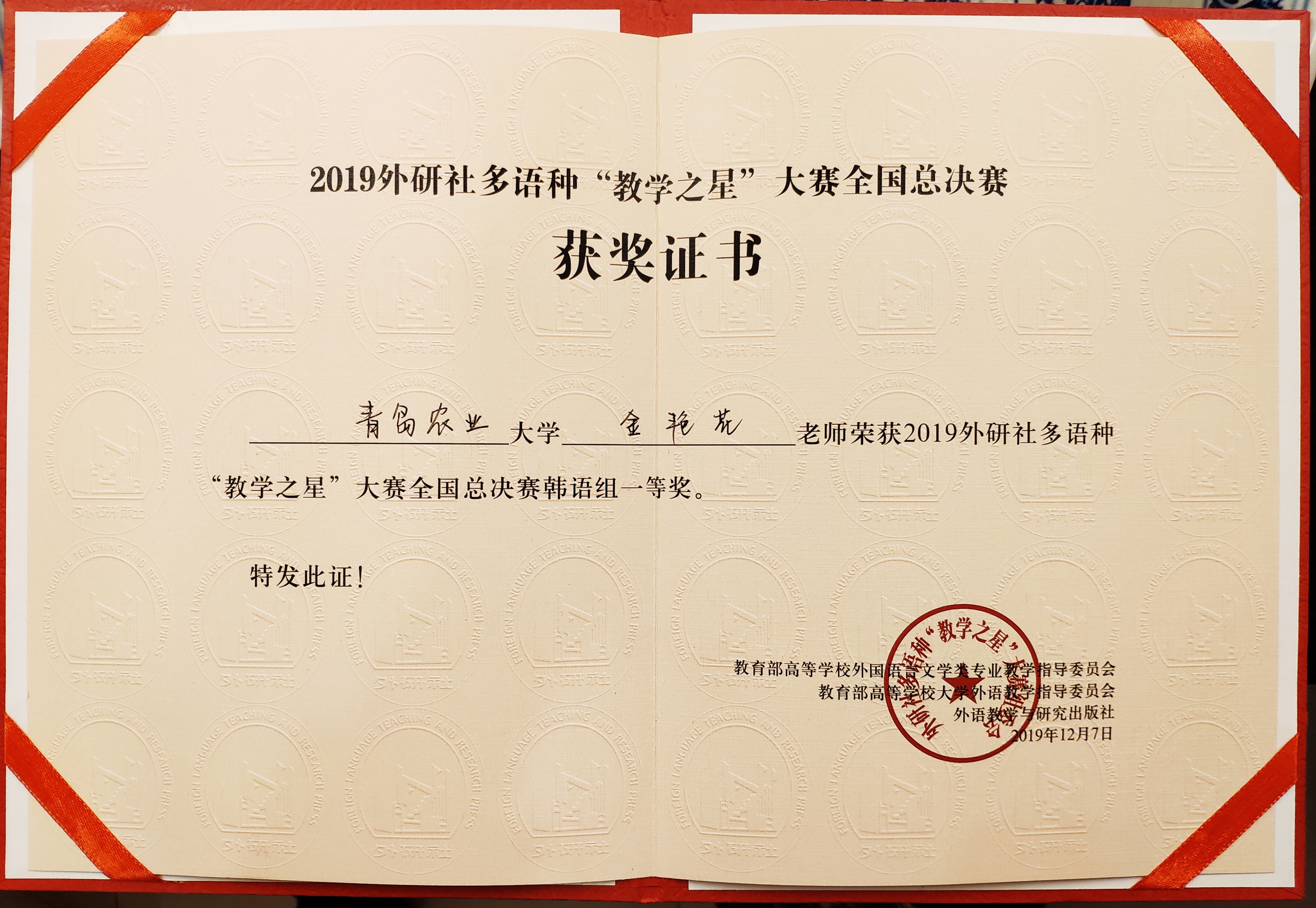 12月7日,2019年外研社多语种“教学之星”大赛全国总决赛在北京落下帷幕,beat365官方网站beat365官方网站教师金艳花荣获韩语组一等奖。