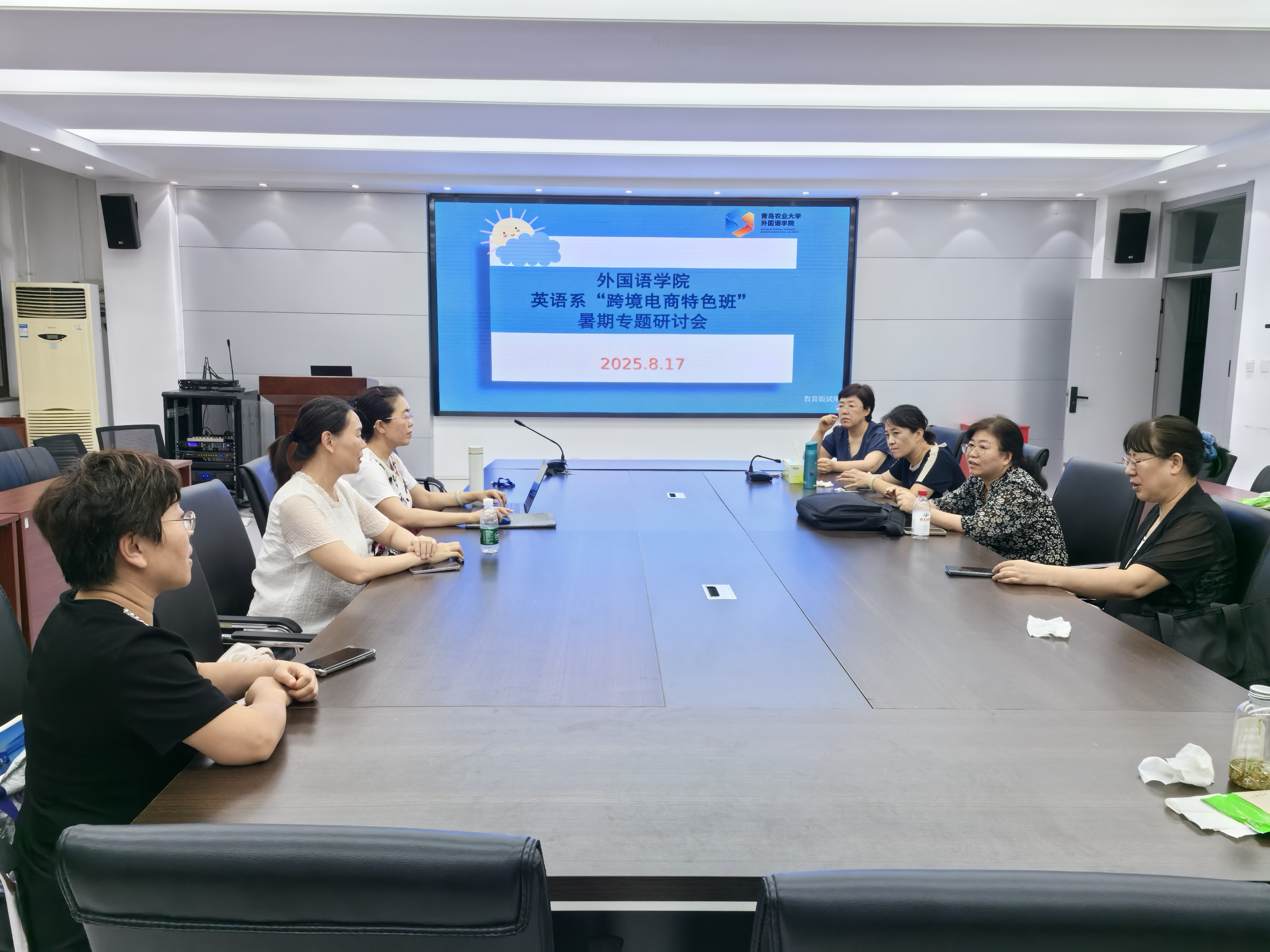 beat365官方网站于2025年8月17日召开“跨境电商特色班”暑期专题研讨会,学院领导和英语系骨干教师在调研报告的基础上,围绕2025级英语专业“跨境电商特色班”的组建工作展开深入讨论,共同研讨特色班的培养方案、课程体系及未来发展目标。参加本次研讨会的有beat365官方网站院长纪卫宁、副院长李春梅、副院长高秀雪、英语系主任徐玉凤、副主任左燕茹以及英语系骨干教师姚雪丽、郭飞、赵清。