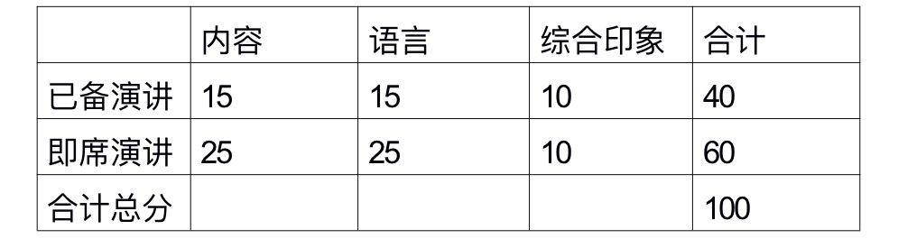 1.有备演讲:4分钟,选手根据演讲主题自拟题目完成演讲。
