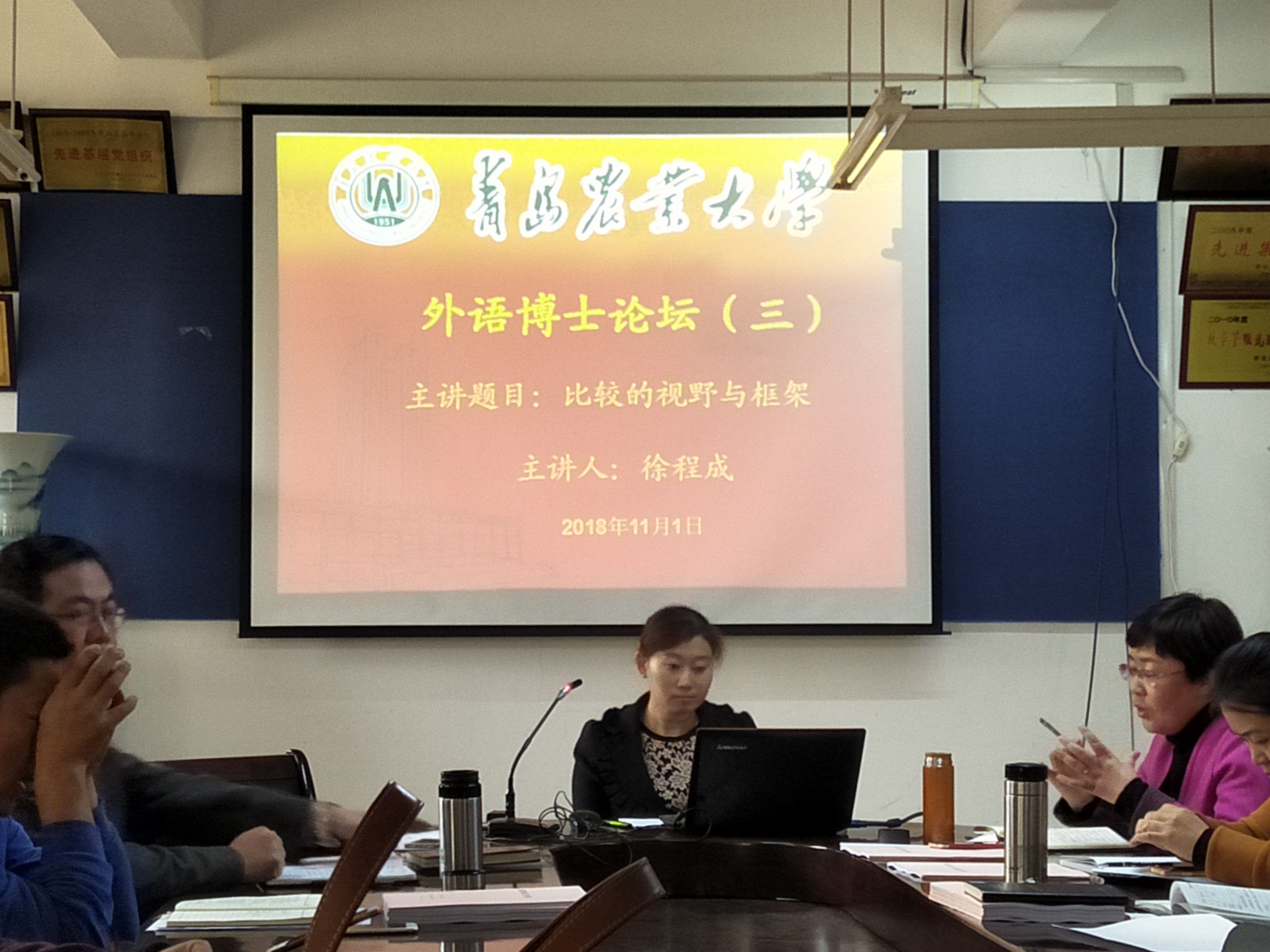 11月1日,beat365官方网站“首届外语博士论坛第三讲”于文经楼会议室顺利举行。此次博士论坛由毕业于东北师范大学的日语教研室徐程成博士主讲,学院全体教职工参加,学院领导纪卫宁主持论坛。