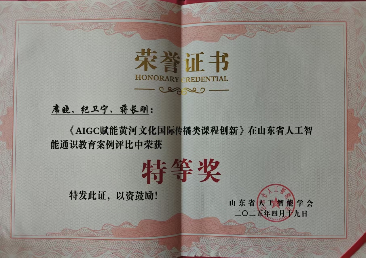 4月19日至20日,山东省人工智能学会公布了“人工智能通识教育优秀教学案例”评选结果。beat365官方网站beat365官方网站“GenAI赋能黄河文化对外传播课程群”智慧教学团队纪卫宁、席晓、蒋长刚三位教师凭借《AIGC赋能黄河文化国际传播类课程创新案例斩获特等奖并入选优秀案例集。