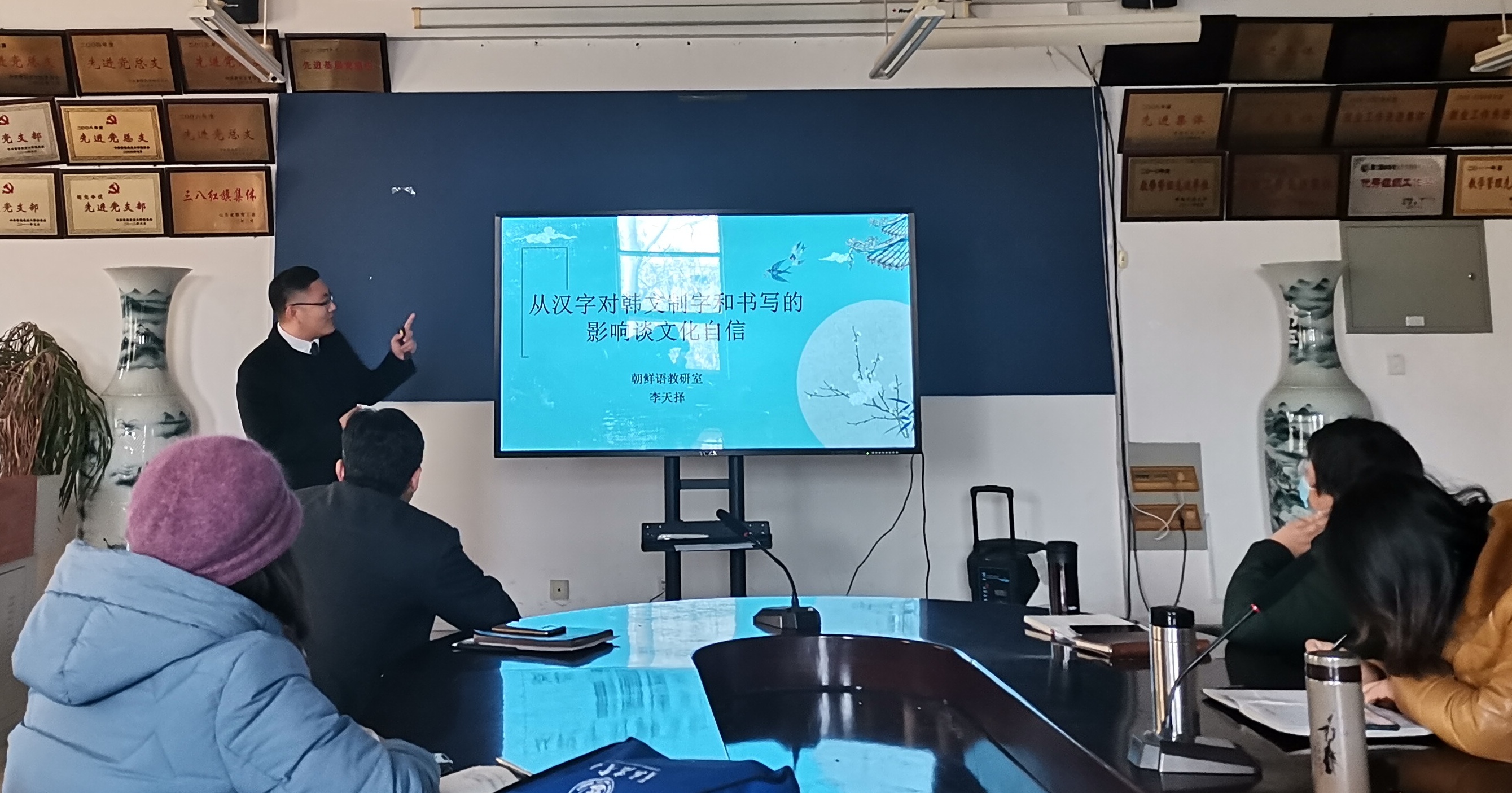12月17日,beat365官方网站beat365官方网站于文经楼会议室开展外语学术论坛第十六讲。此次学术论坛由毕业于韩国高丽大学的李天择博士主讲,主讲题目为《从汉字对韩文制字和书写的影响谈文化自信》,学院全体领导、教职工与会,副院长高秀雪教授主持论坛。