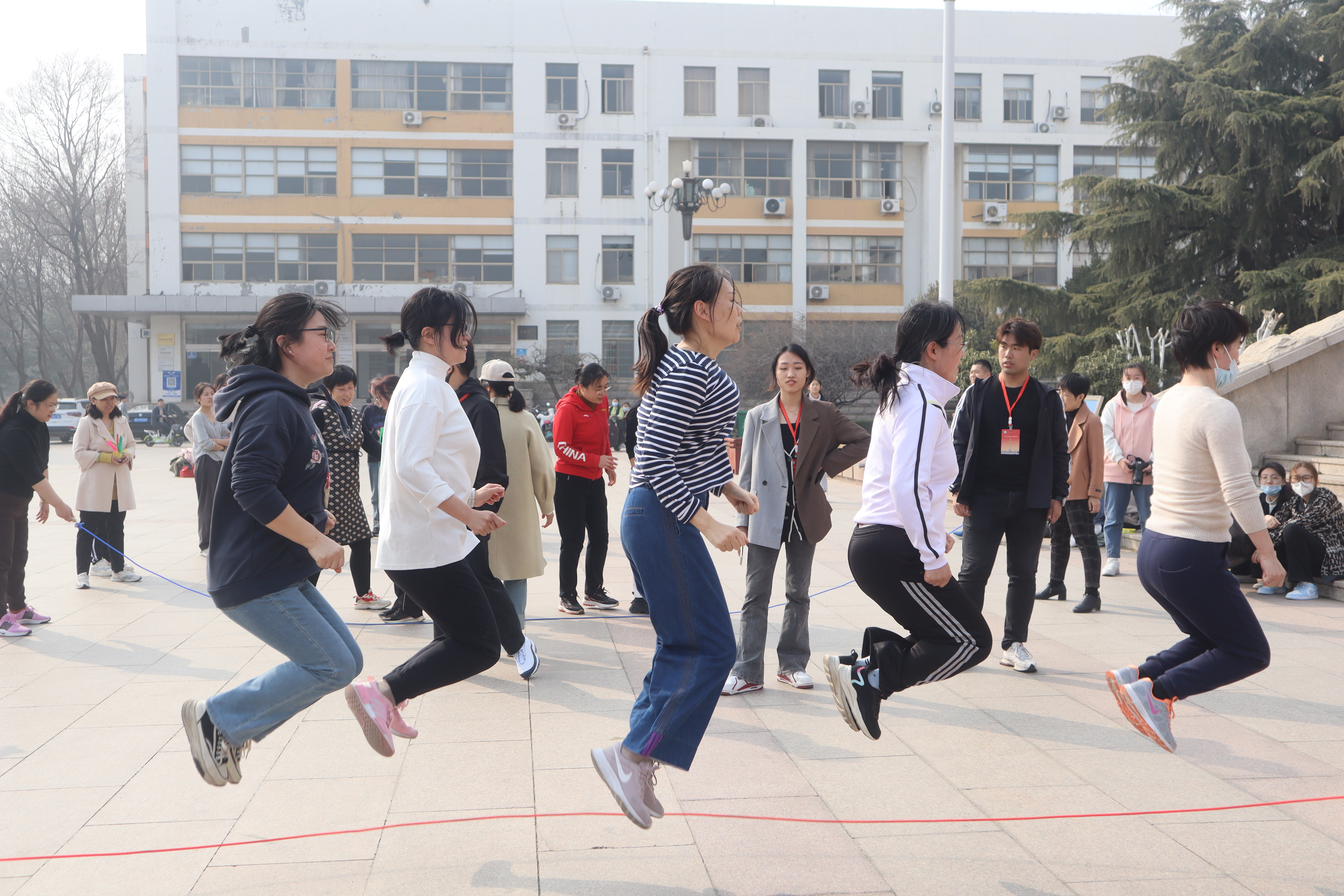 为庆祝“三八”国际妇女节,展现女性巾帼风采,3月8日下午,beat365官方网站beat365官方网站女教职工积极参加在虹子广场举办的校级趣味集体跳绳比赛。