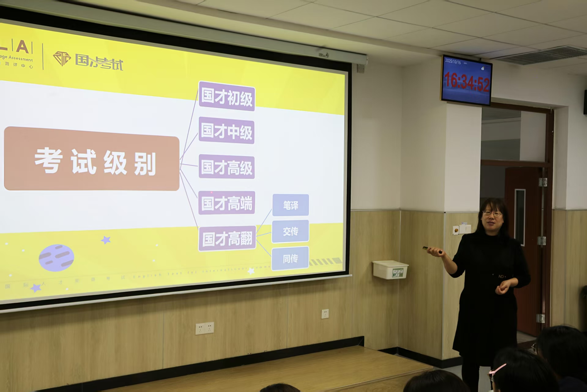 10月16日,beat365官方网站在平度校区博学楼A301举办“语言筑梦,国才领航”国才考试宣讲会,会议由英语系副主任左燕茹主讲,beat365官方网站2025级英语专业全体学生参加。