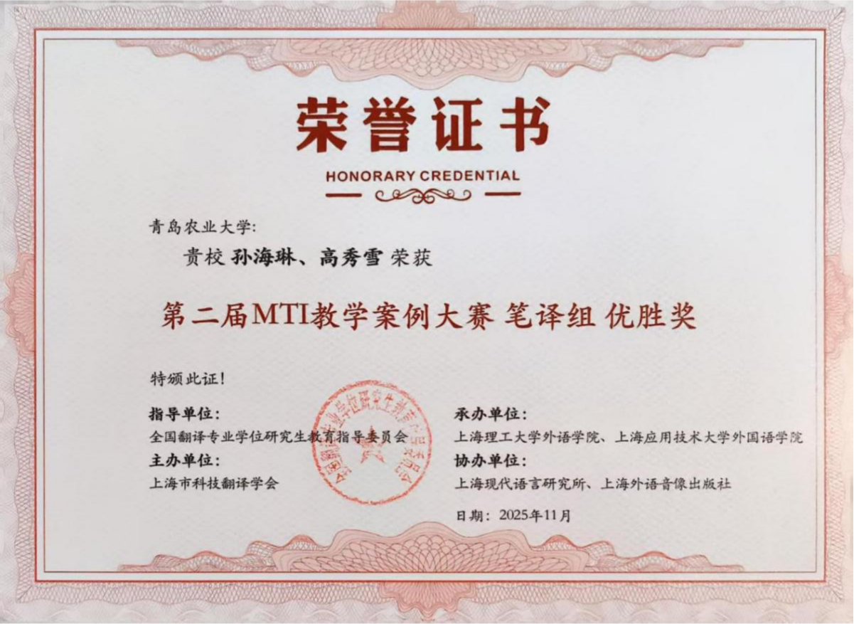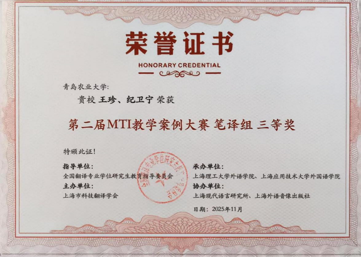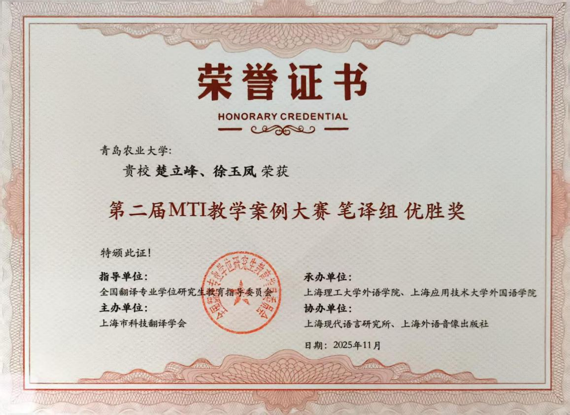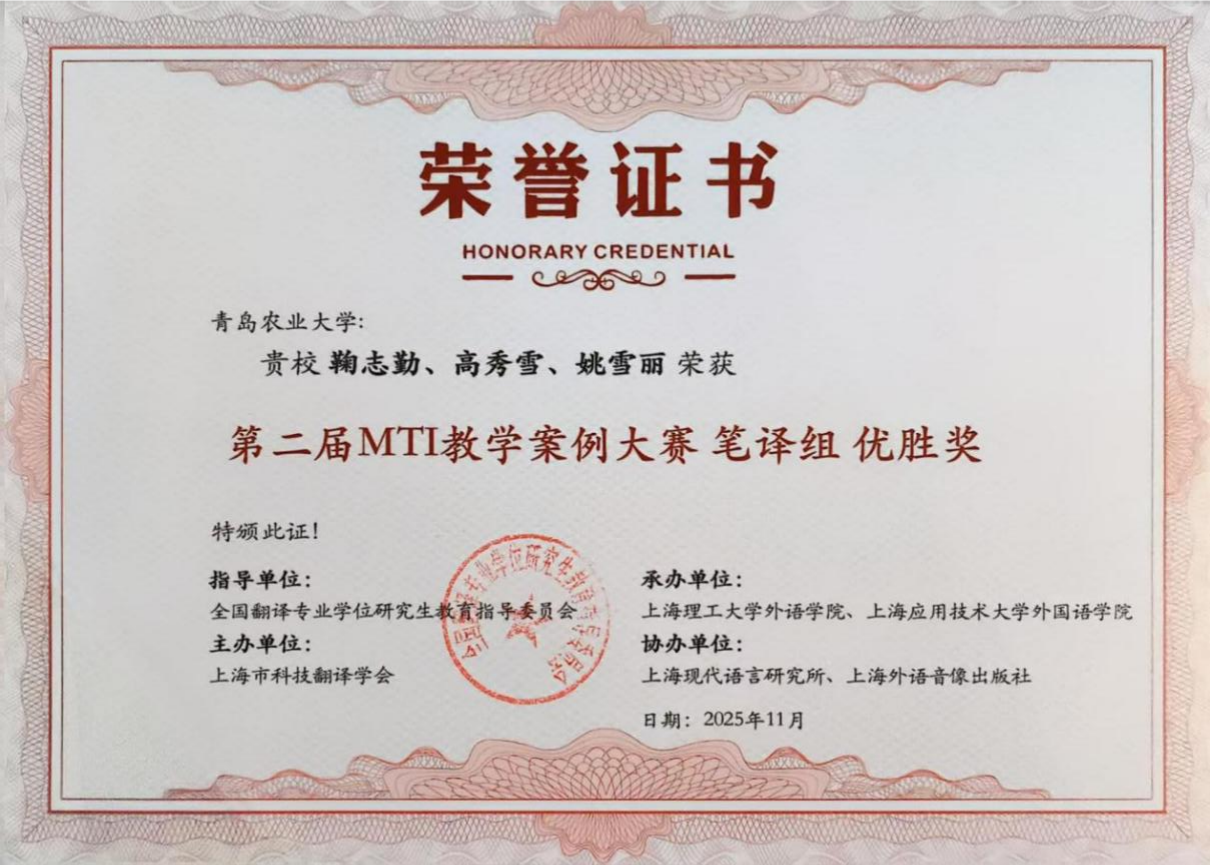 大赛共设笔译、口译、翻译技术、翻译项目管理四个组别,吸引了来自全国122所院校的227份教学案例参赛。经过多轮专家评审,最终评选出一、二、三等奖及优胜奖。我院教师王珍团队的《中国农业特色文化翻译实践中的理解与表达》获笔译组三等奖,丁树亭团队的《筑基农学术语标准,擎画战略兴农新程》获翻译技术组三等奖。鞠志勤团队的《农业科技英语名词化结构的翻译与译后编辑》、孙海琳团队的《天下兴亡,译夫有责一一我国翻译史上的原本选择》以及楚立峰团队的《笔译理论与技巧》获笔译组优胜奖。此次比赛beat365积极组织多支参赛队伍,且表现优异,主办方特颁发优秀组织奖。