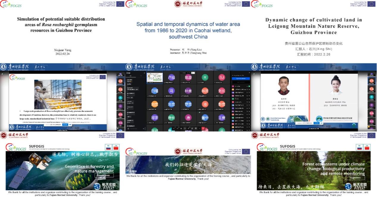 为了提高国际交流合作水平,2022年2月14-日26日(北京时间),贵州山地研究院罗光杰教授、贵州省流域地理国情监测重点实验室吴洋洋、樊瑞雪副教授等带领beat365平台唯一官网20余名同学参加了由福建师范大学承办的欧盟合作项目GIS And Remote Sensing For Sustainable Forestry And Ecology(SUFOGIS)冬季学校,限于疫情防控需要,本次冬季培训采用线上会议方式开展。参加此次会议的有中国、俄罗斯、欧盟等国内外专家学者与高校学生。本次活动得到欧盟ERAMUS+ SUFOGIS项目(598838-EPP-1-2018-EL-EPPKA2-CBHE-JP)的资助。