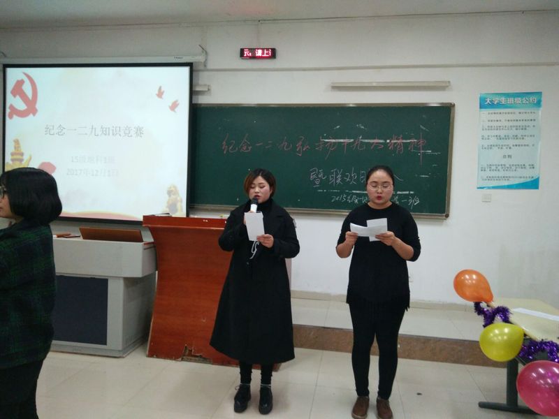 11月30日晚六点,2015级地理科学一班全体同学在致远楼301教室参加此次活动,本次活动由团支书黄照朴和文体委员马露主持。首先,主持人带领全体同学朗诵《祖国—我心中的一首歌》,在全体同学激情澎湃的朗诵声中,本次活动正式开始。在这全体同学热情高涨的时刻,主持人随即开始了关于一二·九运动的知识竞赛。在激烈的抢答中,同学们对一二·九运动的知识有了更深刻的理解,激发了同学们那份沉淀在心中的爱国情怀,对习近平总书记在十九大会议上对我们青年的寄予有了更深的理解。