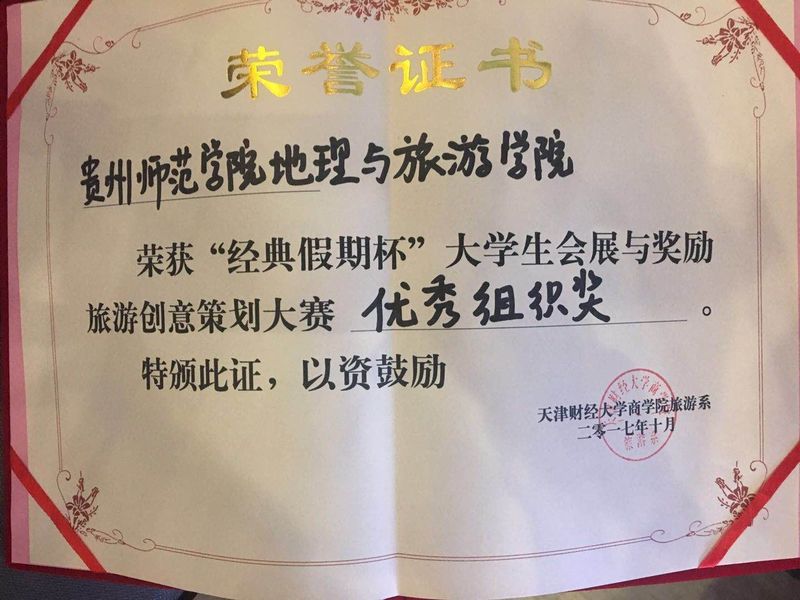 在学院创新创业办公室组织下,2017年10月21—25日,beat365官网地理与旅游学院2016级旅游管理1班学生罗维薇在指导教师白雪副教授的带领下参加由天津财经大学商学院主办的“经典假期杯”大学生会展与奖励旅游创意策划大赛。本次大赛共有来自全国20余所高校、100余支队伍参加初赛,共15支队伍进入决赛。beat365官网地理与旅游学院2016级旅游管理1班学生罗维薇、梁玲、刘立、潘悦、刘维涛同学提交的参赛作品《传统工艺,指触未来》在初赛中脱颖而出,通过初赛顺利入围决赛。该组参赛同学在学院白雪老师悉心指导下,在决赛中表现优异,荣获优秀奖。同时,beat365官网地理与旅游学院获得了主办方颁发的优秀组织奖。