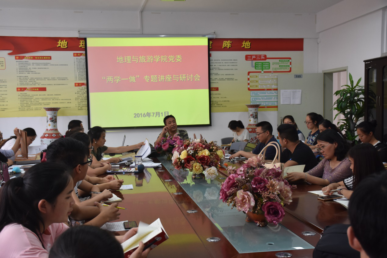 7月1日,恰逢党的95周岁生日之际,地理与旅游学院党委在组织全体党员于上午自行收看习近平总书记在庆祝中国共产党95周年大会上的讲话直播后,下午立即组织举行“两学一做”专题党课与集中学习研讨会。专题党课由学院党委书记吴亚平主讲,教工党支部与学生党支部全体党员参与本次党课;专题党课完成后,教工党支部组织召开了“两学一做”集中学习研讨会。