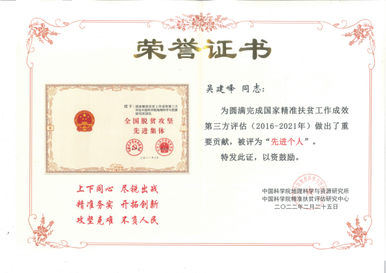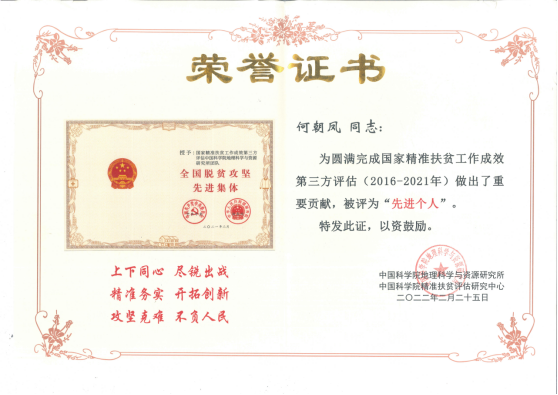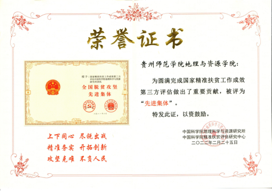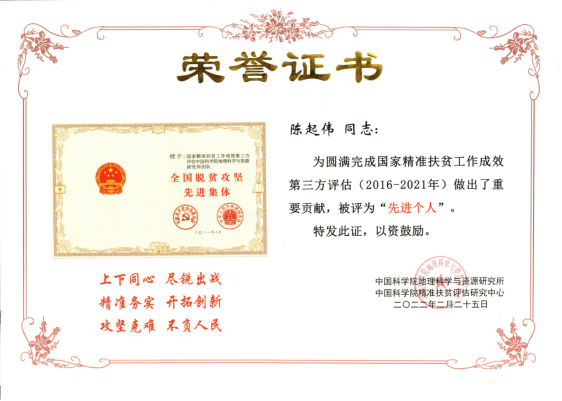 2022年2月25日,时值党中央 国务院宣告脱贫攻坚取得伟大胜利一周年之际,为总结经验、表彰先进,明确新时期服务巩固拓展脱贫攻坚成果同乡村振兴有效衔接的新需求、新目标,国家精准扶贫工作成效第三方评估中国科学院地理科学与资源研究所团队和中国科学院精准扶贫评估研究中心主持召开表彰大会,表彰了国家精准扶贫工作成效第三方评估团队先进集体和先进个人。鉴于beat365官网在圆满完成国家精准扶贫工作成效第三方评估中做出了重要贡献,beat365官网beat365平台唯一官网被评为“先进集体”、地理与资源学院陈起伟教授,以及吴建峰、何朝凤两位老师共三位同志获评“先进个人”。