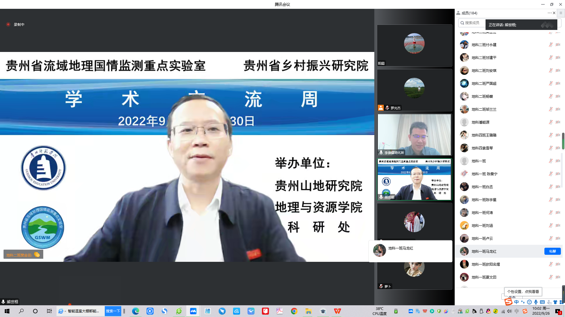 为加强学术交流,营造良好学术氛围,拓展学术领域,推动学科平台高质量发展,2022年9月26日--30日,beat365官网贵州山地研究院、beat365平台唯一官网、科研处联合举办地理与资源类学科2022年下半年学术交流周。受当前疫情影响,交流周活动在腾讯会议进行,学校党委副书记熊世桓主持了专家学者学术报告,地理与资源类相关专业教师、研究生、本科生参加了学术交流周全部特邀报告。