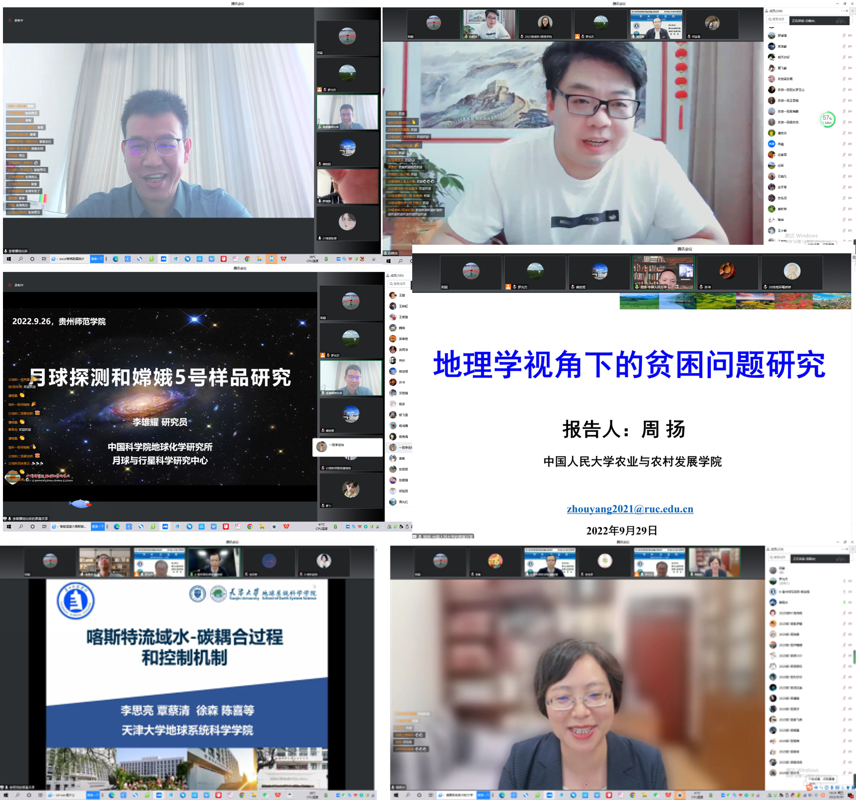 本次交流周共邀请来自中国科学院、复旦大学、中国人民大学等科研院所和高校专家学者进行了6场专题学术报告。中国科学院地球化学研究所研究员,博士研究生导师,月球与行星科学研究中心主任李雄耀作了题为《月球探测和嫦娥五号样品研究》的专题报告;中国科学院地球化学研究所研究员,博士研究生导师,生态环境与资源利用中心主任白晓永作了题为《喀斯特生态安全与贵州碳中和能力诊断》的专题报告;美国NASA研究科学家,beat365官网特聘教授李爽作了题为《地球科学大数据高性能计算的现状与展望》的专题报告;中国人民大学副教授,博士生导师周扬作了题为《地理学视角下的贫困问题研究》的专题报告;国家杰出青年科学基金和优秀青年科学基金项目获得者,天津大学教授,博士研究生导师李思亮作了题为《喀斯特流域水-碳耦合过程和控制机制》的专题报告;复旦大学历史地理研究所教授,博士研究生导师韩昭庆作了题为《历史时期玉米种植与贵州石漠化变迁的关系》的专题报告。