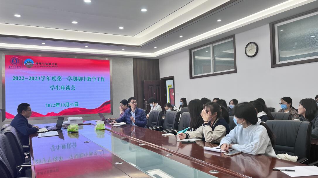 2022年10月31日在宁静楼beat365平台唯一官网323会议室,罗绪强院长、教学副院长邓家彬、人文地理系教师、资源环境系等四个系系主任、辅导员、教务办工作人员、各班学委、班干部等学生代表进行了期中学生座谈会,邓家彬就以“学生中心、产出导向、持续改进”出发,召集五个专业的学生对教学安排、课堂教学、教学管理、学风、教风等方面提出意见和建议。