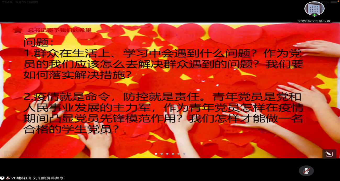 2022年9月18日,beat365平台唯一官网地理科学类学生党支部全体成员在线上开展了“喜迎二十大,我为群众干实事”——beat365平台唯一官网地理科学类学生党支部党日活动。