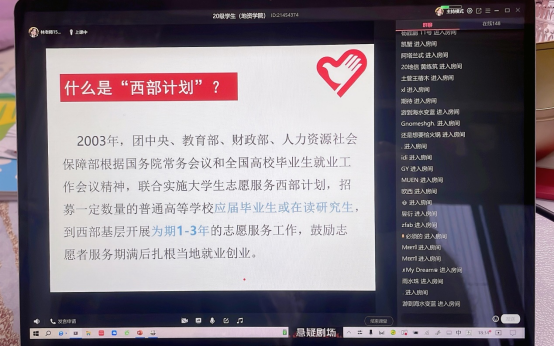 宣讲会上,林丽全面解读了西部计划与大学生志愿服务贫困县计划,增强了同学们对西部计划等国家基层服务项目的了解和认识。并分别就政策调整与优化、政策待遇、专项设置、服务内容和岗位设置等方面为同学们进行详细解答,拓宽了同学们的职业选择渠道,鼓励有意愿的应届毕业生投身于西部事业。
