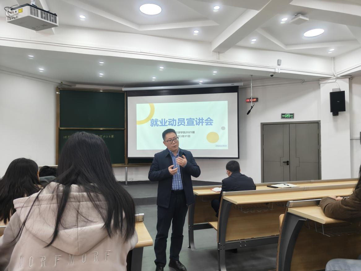 为深入贯彻党中央国务院、省委省政府关于高校毕业生就业创业工作的决策部署,扎实推进学院毕业生高质量充分就业,3月31日,beat365平台唯一官网在宁静楼235教室召开了2025届毕业生就业动员宣讲会。学院院长兼党委副书记罗绪强、学院党委副书记王万强出席会议并作专题指导,2021级全体学生参加会议。会议由2025届毕业班辅导员刘丹丹主持。