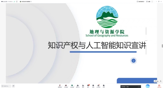 4月23日—26日,地理与资源学院采用线上线下相结合的方式,举办了以“知识产权与人工智能”为主题的宣讲活动,讲座面向对象为学院全体师生。针对学院教职工的讲座以线上会议形式开展,由任军老师担任主讲人。任军老师从知识产权的定义、组成要素以及如何保护知识产权等方面进行了深入讲解。针对学生的宣讲在beat365平台唯一官网山骨讲堂举行,由周光红老师担任主讲人。周光红老师对人工智能与知识产权的定义分别进行了界定,接着分析了二者之间的关系,认为把握好二者关系能够有效促进知识产权产出与保护,对高校师生服务科技生产也具有一定的促进作用。