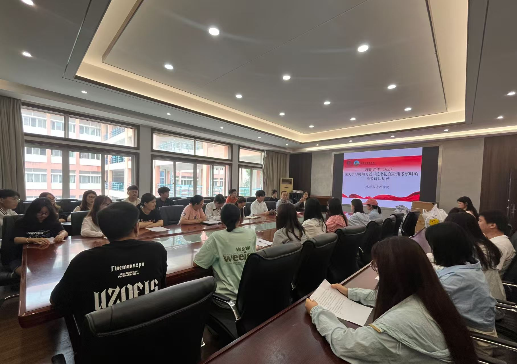 为深入学习贯彻习近平总书记在贵州考察时的重要讲话精神,教育引导广大青年学子深刻把握讲话蕴含的思想内涵与核心要义,切实将学习成果转化为推动学业进步与事业发展的实际行动。4月23日,地理与资源学院在宁静楼323会议室开展了以“深入学习贯彻习近平总书记在贵州考察时的重要讲话精神”为主题的“理论宣传二人讲”活动。学院党委副书记王万强、地理科学类学生党支部书记刘丹丹担任主讲人,学院70余名学生党员参加了此次活动。